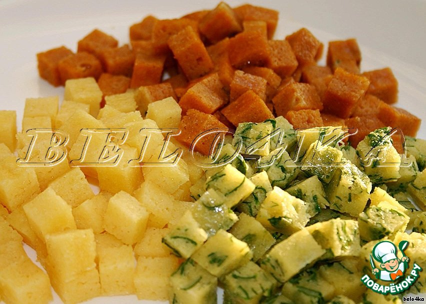 Правда гренки у меня не вышли, скорее кубики которые похожи на мякиш хлеба. Вместо шпината взяла укроп. Думаю, в следующий раз получиться лучше))