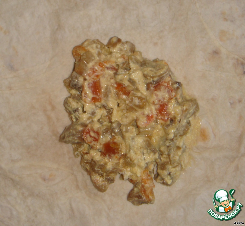 Взять лаваш, выложить на него приготовленные грибы.