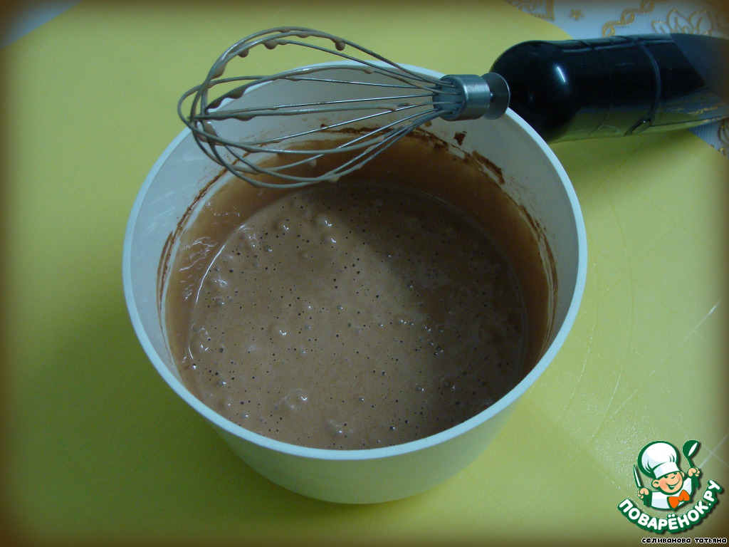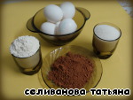 Взбиваем яйца с сахаром в крепкую пену. Муку соединяем с какао, просеиваем и всыпаем во взбитые яйца.