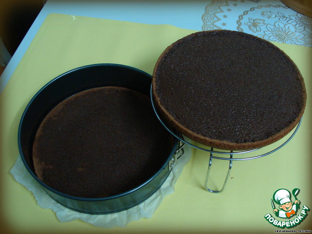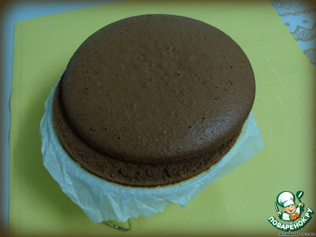 Готовый бисквит разрезать на два коржа