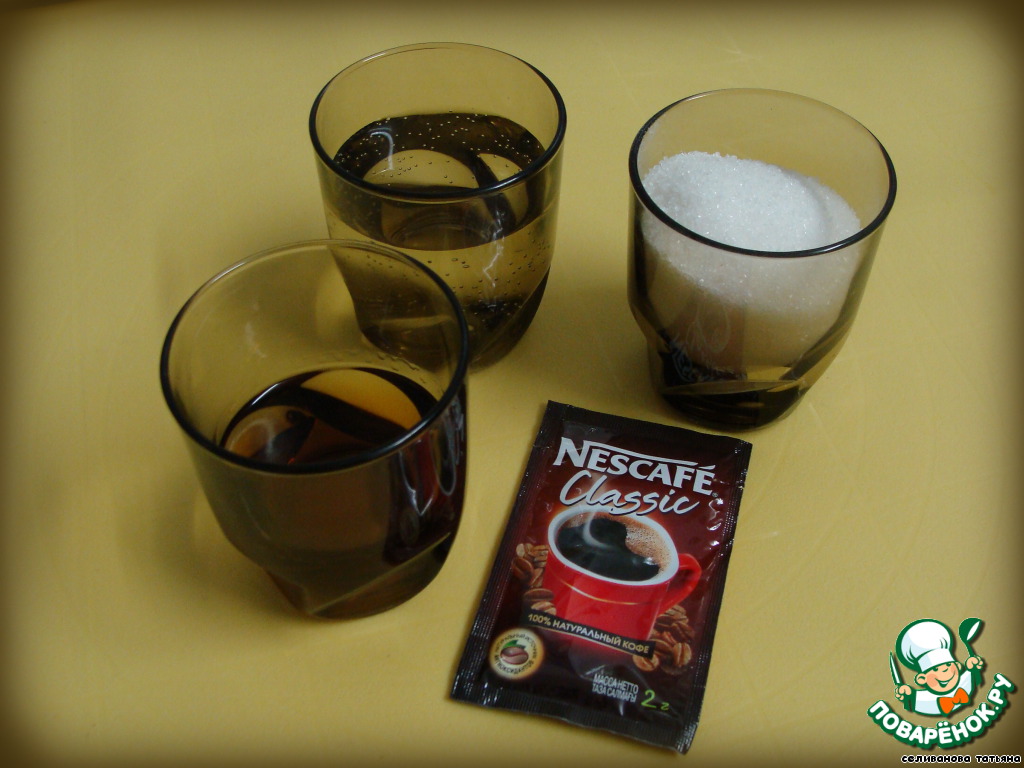 Для приготовления кофейного сиропа воду с сахаром довести до кипения и кипятить 10 минут. Остудить, влить ром (коньяк).