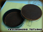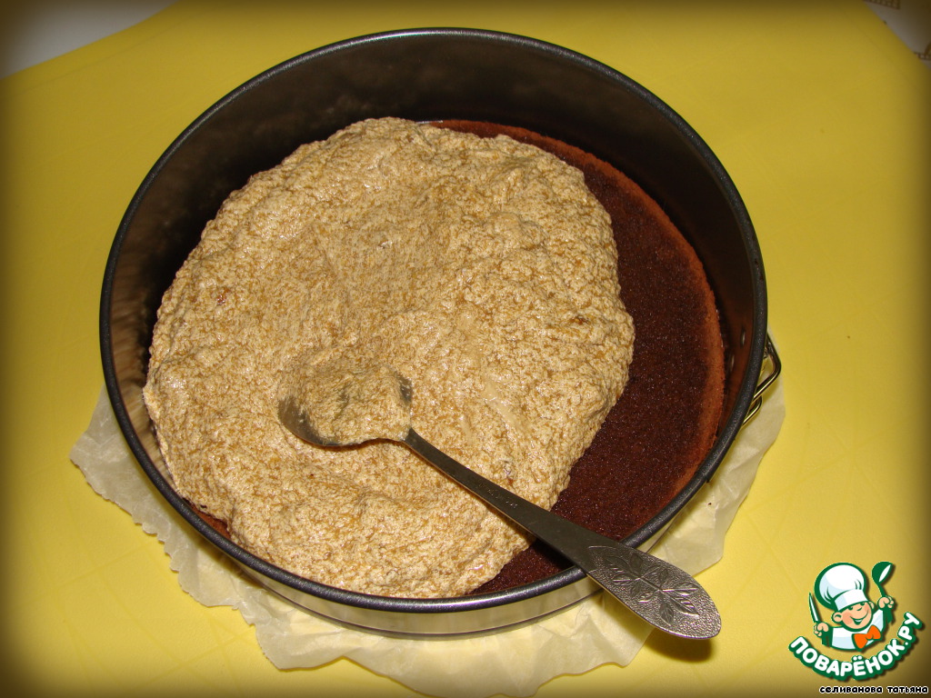 В разъемную форму помещаем бисквитный корж, выкладываем на него кофейное суфле и сверху - второй бисквит. Хорошо придавливаем. Ставим в холодильник.