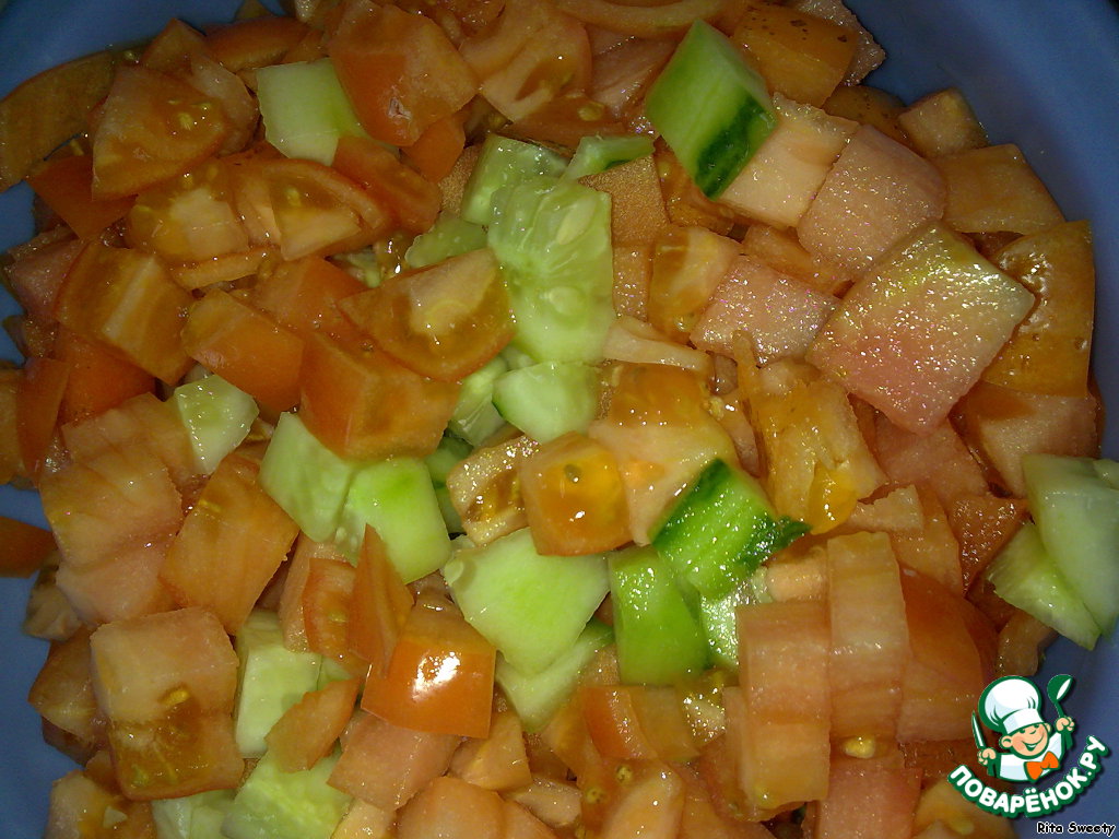 Нарезать огурцы и помидоры средними кусками