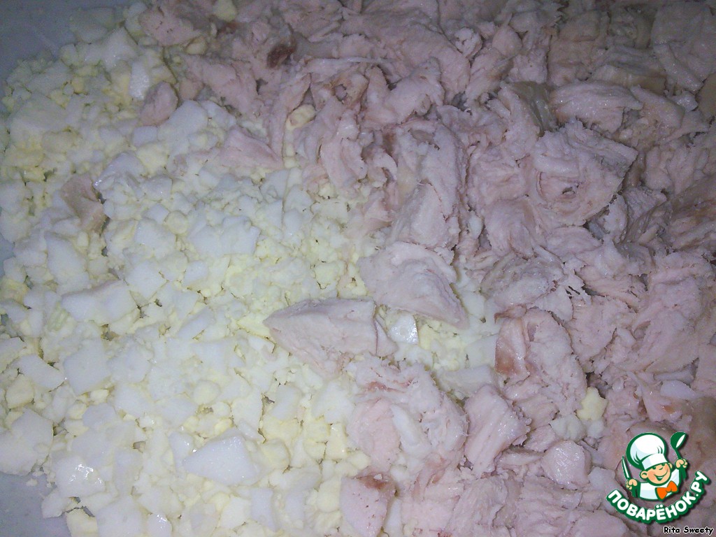 Яйца и грудку мелко нарезать