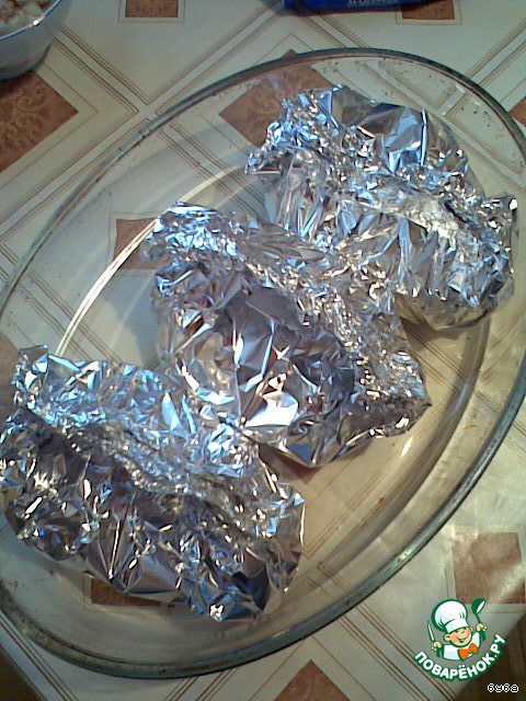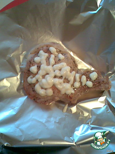 Затем каждый карбонадик кладем на кусок алюминиевой фольги, смазываем майонезом и запекаем в духовке.