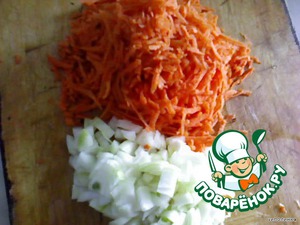 • Морковь натереть на крупной тeрке. Лук мелко порезать.