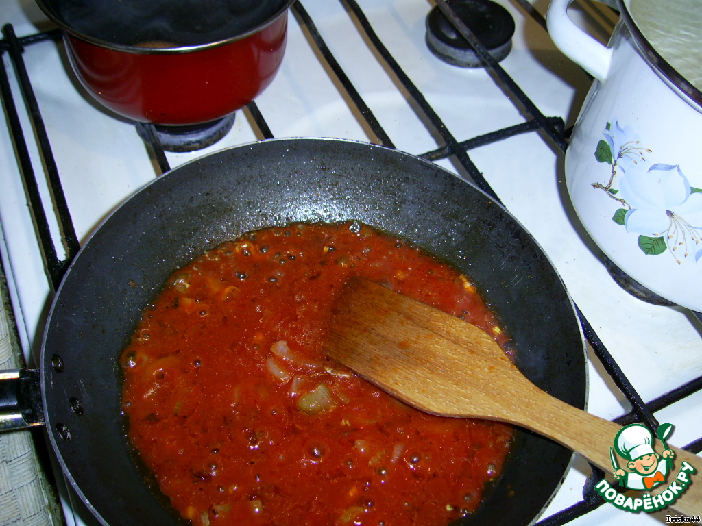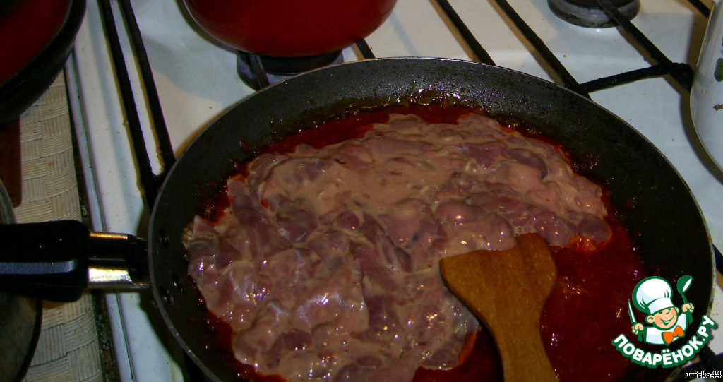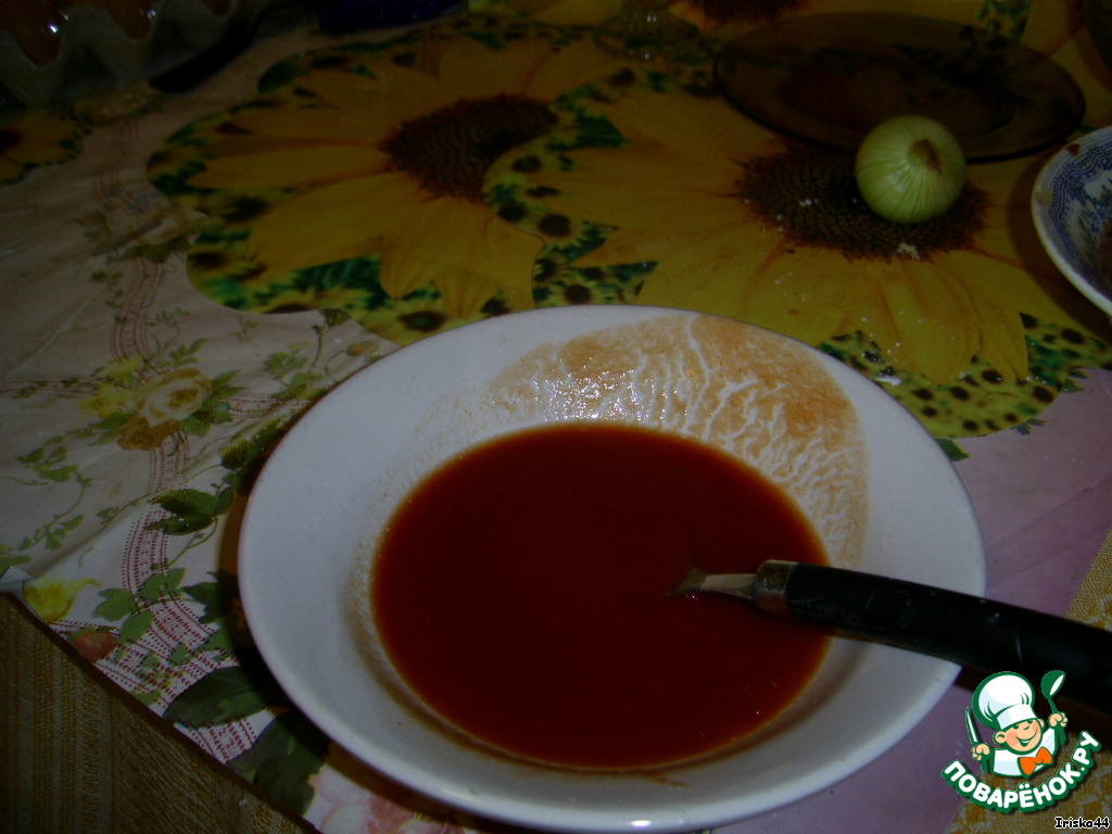 Пока печень пропитывается ароматом имбиря и чеснока, замешиваем соус для жарки. Смешиваем бульон, сахар и томатную пасту.