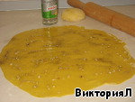Из полученного теста раскатать две тонкие лепешки толщиной примерно 1 мм, смазать маслом с чесноком, посыпать черным перцем и скрутить рулетики, защипав край, чтобы в процессе варки рулетики не раскрутились.