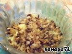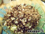 Шампиньоны и лук мелко нарезать, посолить, обжарить в небольшом количестве растительного масла.