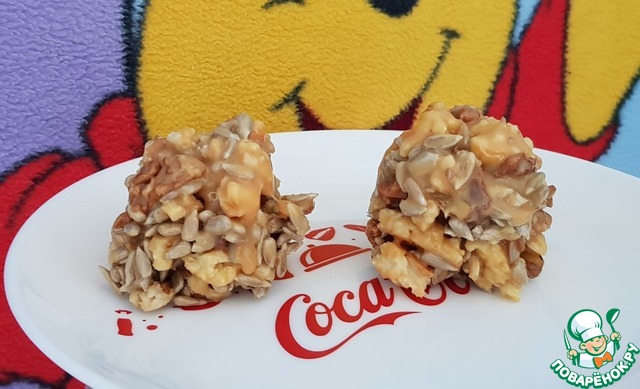 Противень покрыть бумагой для выпечки и на нее потереть тоненьким слоем на крупной терке тесто. Выпекать, пока не зарумянится. Испеченную стружку сложить в большую миску, высыпать чищенные (вкуснее, если предварительно обжаренные) семечки и вареную сгущенку. Все хорошо вымешать.