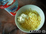 Сыр натереть на средней терке, выдавить зубчик чеснока, добавить 2 ч.л. сметаны, перемешать.