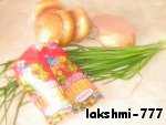 Продукты для корзинок: тостерные булочки, варёная колбаса, солёная соломка и зелёный лук с длинными перьями.