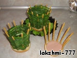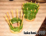 А дальше берём зелёный лук и начинаем переплетать между палочками в шахматном порядке.