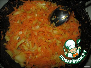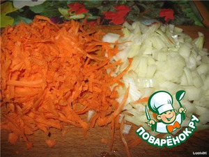 Морковь потереть на крупной терке, лук порезать не очень крупно