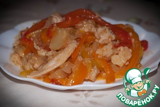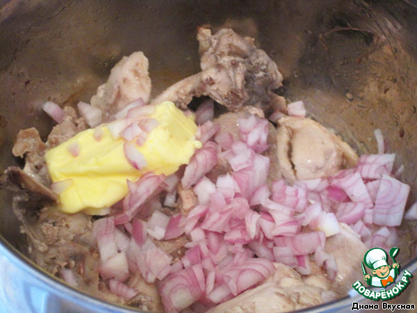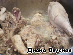 Курочку (желательно свежую и молодую, а не мороженную, поверьте вкус намного лучше)нарезала и сняла кожу. Поставила на огонь средний и протушила в собственном соку.