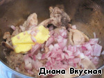 Когда сока почти не осталось, положила масло и насыпала нашинкованный лук. Все это поджарила до скудной золотистости и минуты две, помешивая, подержала на медлянном огне с добавлением томата.