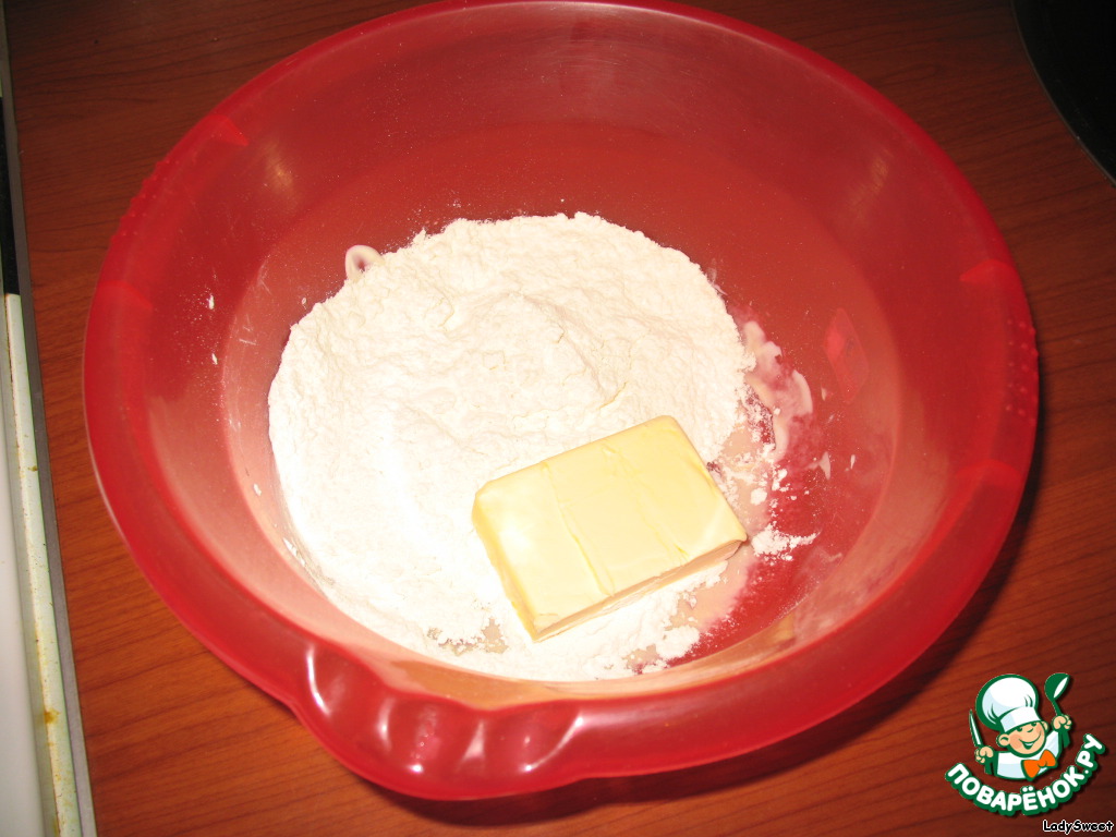 Муку соединить со сливочным маслом, порубить. Влить яйца с майонезом, посолить, замесить тесто.