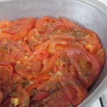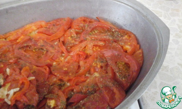 Затем режем кружочками помидоры и укладываем поверх риса.