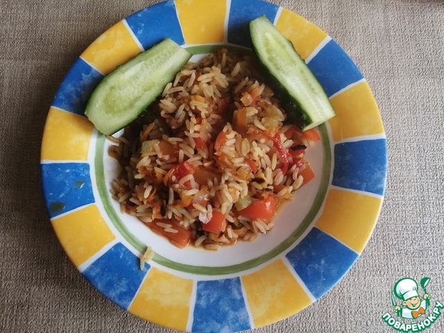 Далее режем перец соломкой и выкладываем сверху. Эти 2 слоя уже не перемешиваем. Сверху посыпаем майораном. Закрываем крышкой, ставим тушиться на маленький огонь примерно на 1 час. Никакой воды лить не надо - рис великолепно пропаривается в масле и соке от овощей.