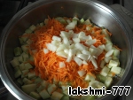 Берём сковороду с толстым дном. Думаю, у каждой хозяйки сейчас есть такая (у меня лично уже 10 лет посуда BergHOFF). Наливаем на сковороду растительное масло. Режем кубиками кабачок, морковь трём на крупной тёрке и шинкуем кубиками лук. Разогреваем немного масло и накладываем кабачки, затем морковь и сверху - лук, слегка присаливаем и обжариваем минут 5, перемешиваем. Газ временно выключаем.