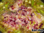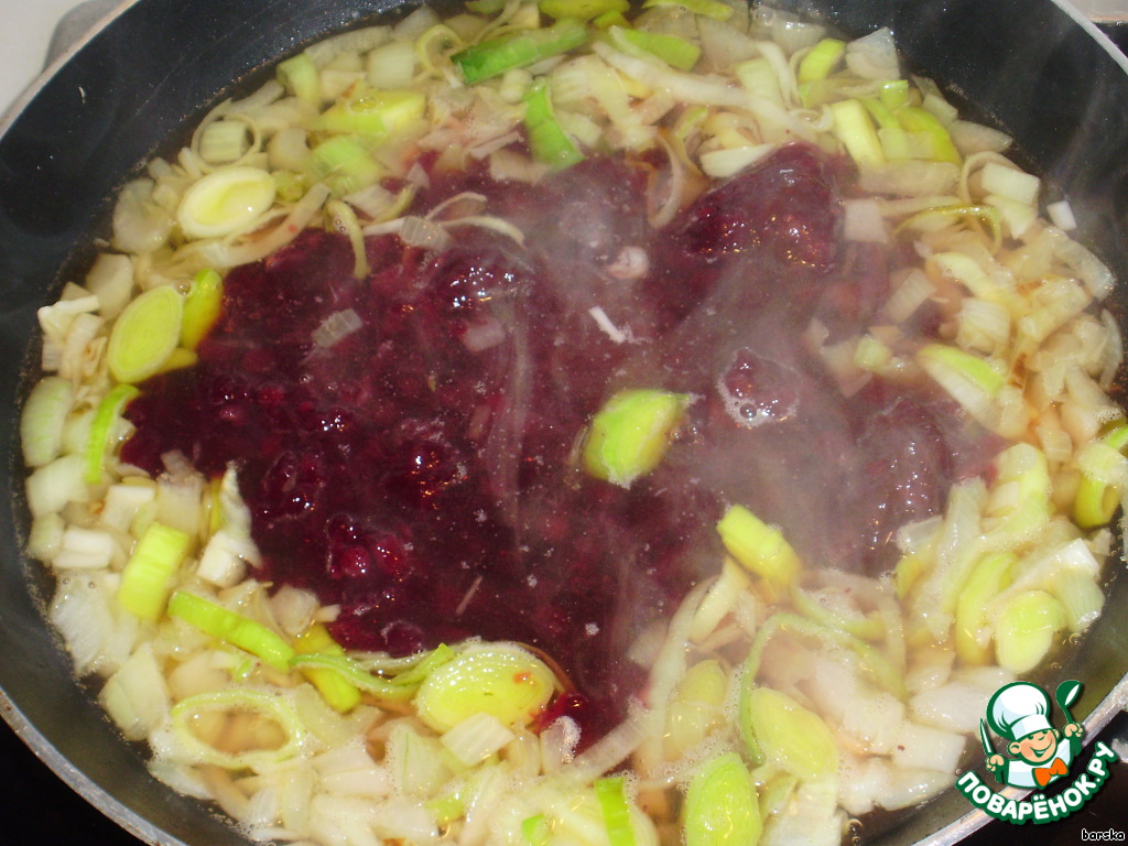 В 1 ст.л. растительного масла поджарить оставшийся лук до прозрачности, добавить оставшееся брусничное варенье (я добавляла меньше - 3 ст.л.). Протушить 5-8 минут.