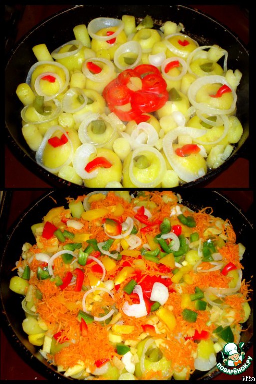 Через 20 минут сковороду из духовки вынуть. Присыпать картофель порезанным перцем, луком и тёртой морковью.