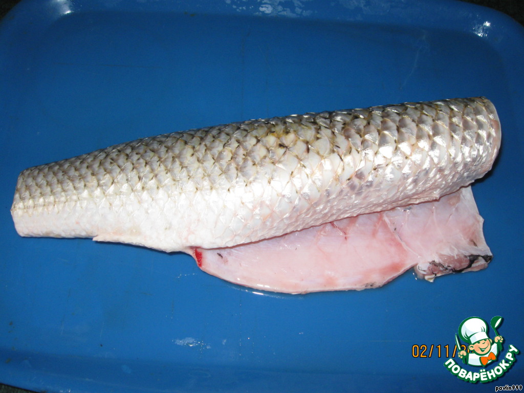 Для приготовления данного блюда подойдёт рыба средних размеров с небольшим количеством костей, в данном случае - пеленгас. Можно таким образом приготовить и более крупную рабу, но тогда необходимо увеличить время засолки и маринования.
