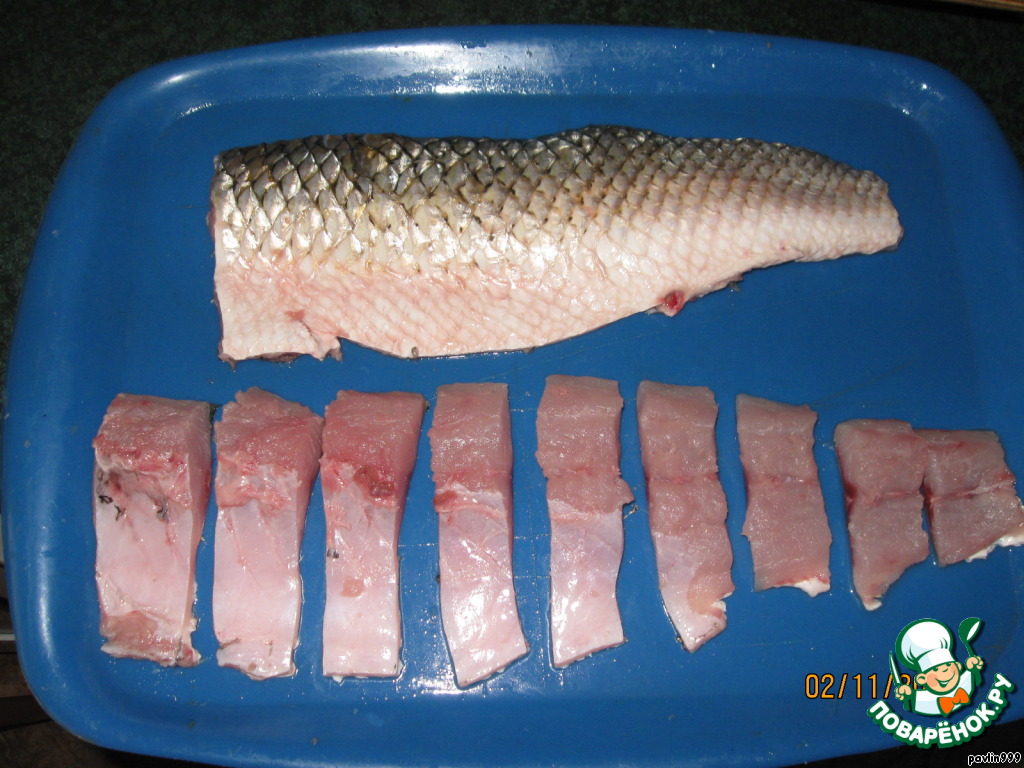 Филе разрезать на кусочки шириной 3-3,5 см.