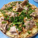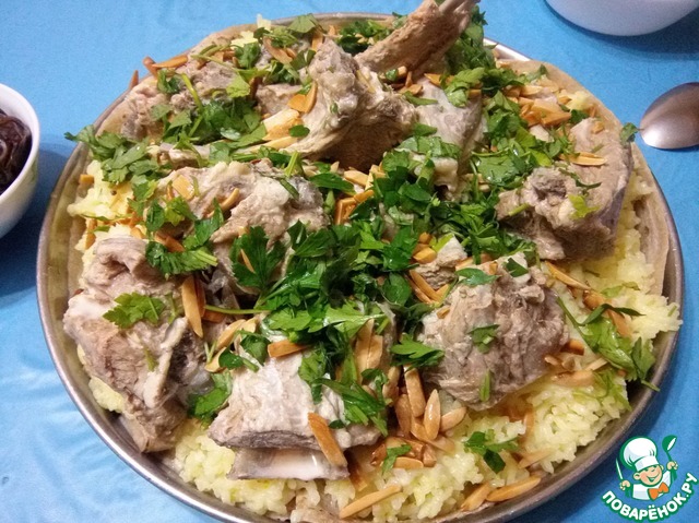 Берем большой поднос, выкладываем на него тонкий лист лаваша, затем рис, а сверху мясо, заливаем сверху соусом, затем