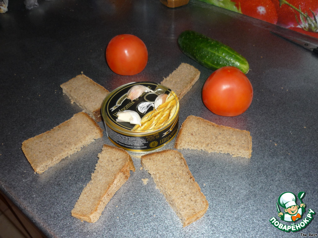 Натираем хлеб чесноком, выкладываем на него помидор, огурец и шпроты.