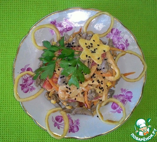 Рецепт «Салат с куриными сердечками и блинчиками»: