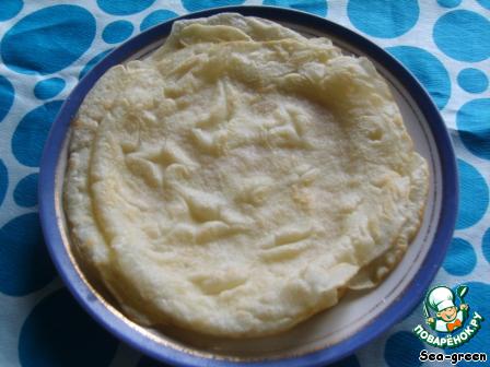 Для блинчиков: яйца слегка взбить, добавить крахмал, масло и хорошо перемешать, чтобы не было комочков. Нагреть сковороду без масла и, выкладывая по две столовые ложки полученной смеси, испечь 5 тонких блинчиков. -
