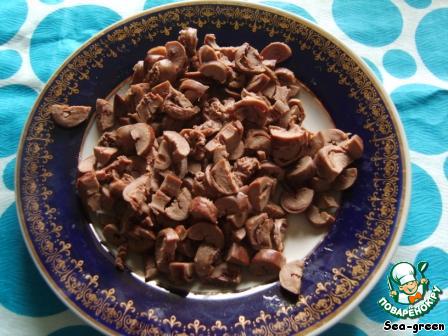 Отваренные и остывшие сердечки нарезать произвольно.