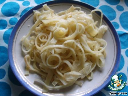 Блинчики свернуть трубочкой и нарезать тонкими лентами.