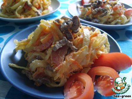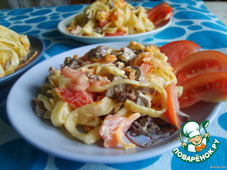 Салат с куриными сердечками и блинчиками