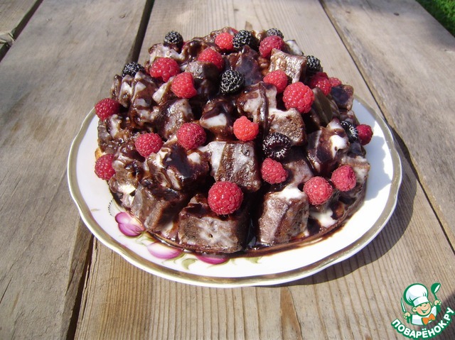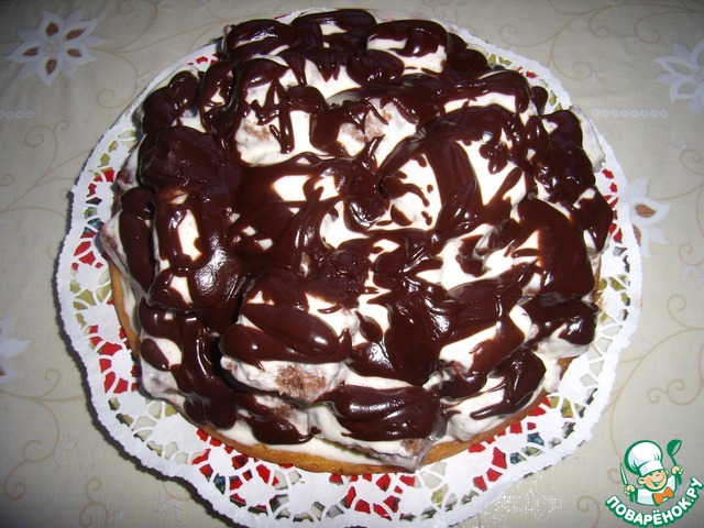 • Собираем торт. На белый корж выкладываем кубики коричневого коржа, предварительно хорошенько обмакнув в сметанный крем. Выкладываем горкой.