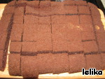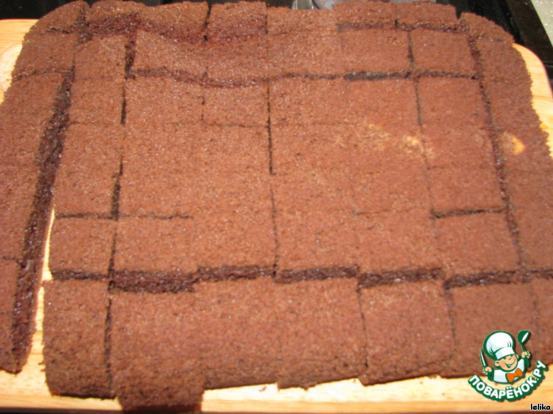 Корчневый корж разрезаем на кубики со стороной примерно 2,5 Х 2,5см.