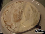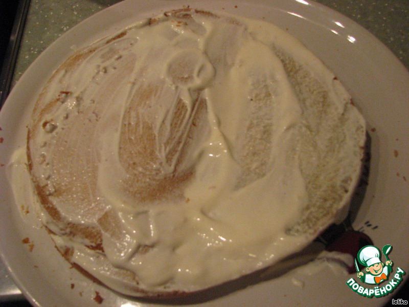 • Белый корж разрезаем вдоль на две половинки и пропитываем кремом. В принципе, можно и не разрезать, все равно пропитается!