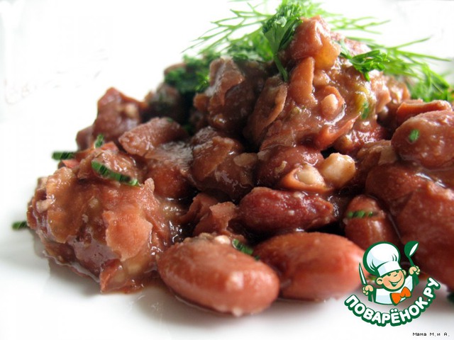 Как только жидкость наполовину выпарилась, добавляем к фасоли зелень, чеснок, орехи, соус гранатовый или сок, сухие травы. Если надо еще - солим и добавляем чуток сахара по вкусу.