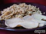 Этот шаг (залить водой, проварить 10 минут, слить) надо проделать еще два раза. И в последний, четвертый раз проварить имбирь 20 минут. Положить его на салфетку и оставить сушиться до утра. Утром я имбирь нарезала на маленькие кусочки. Вот так он выглядел - не очень привлекательно. ))