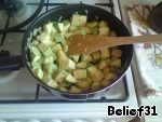 Кабачки чистим, если требуется (у меня молодые, я не чистила) и режем кубиками, отправляем к луку. Жарим, помешивая, 3 минуты.