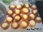 Далее в каждое углубление выкладываем начинку. Творог либо яблочный джем. -