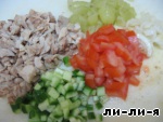 Курятину, помидор, огурец и кислый виноград нарезать мелкими кусочками. -