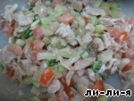 С лука слить маринад. Всё перемешать. Посолить, поперчить по вкусу и заправить майонезом.