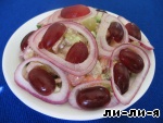 Очень простой, вкусный и сытный салат. Оригинальный вкус благодаря сочетанию маринованного лука и винограда. Данный рецепт был размещен на сайте в 2008 году пользователем Валерьянка под названием "Салат "Венеция"" и иллюстрирован мной в рамках акции "Раскраски".