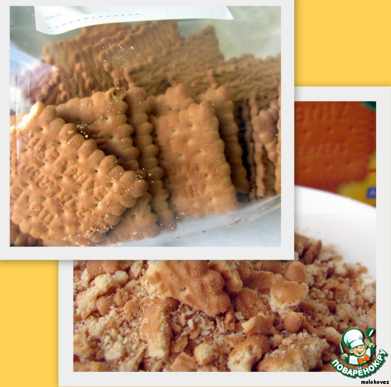 Для приготовления быстрого десерта я взяла пачку печенья и переложила его в полиэтиленовый пакет. Затем скалкой "прокатала" этот пакет пару раз, чтобы печенье раскрошилось. |