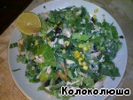 Все это режем (кому как больше нравится) и смешиваем со сметанкой. Добавляем лимонный сок.