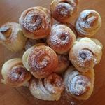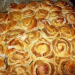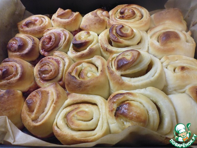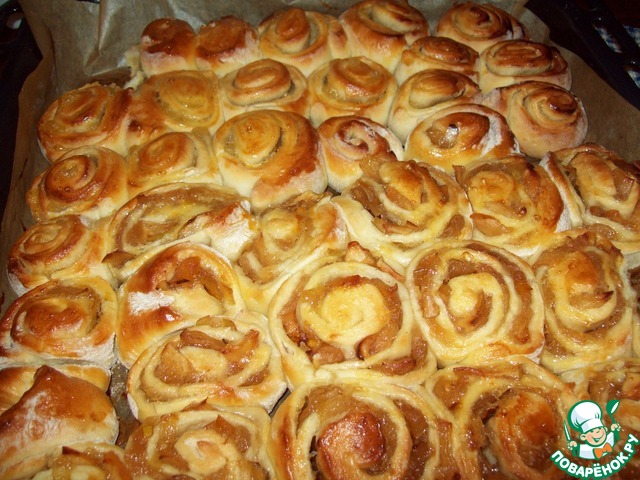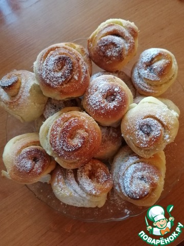 Готовое тесто ещё раз обмять, раскатать пластом толщиной около 0.5 см. Сверху, отступая от края, выложить крем. Аккуратно свернуть рулетом и разрезать на более-менее одинаковые кусочки.