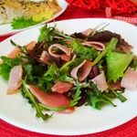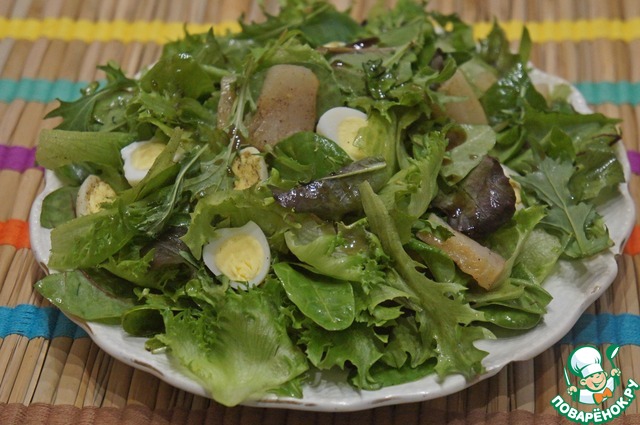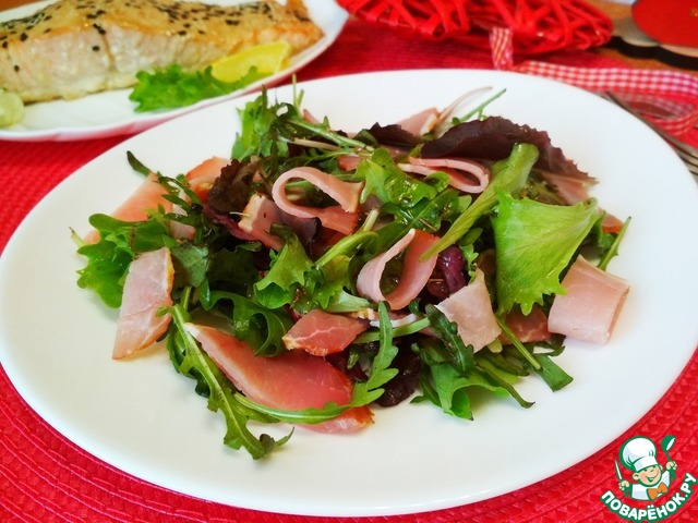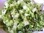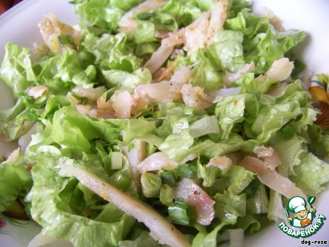 Смешиваем зелень и балык, поливаем остатками заправки, перемешиваем еще раз.