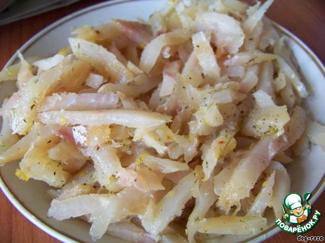 Тонко нарезаем балык, смешиваем с половиной заправки и оставляем на несколько минут.
